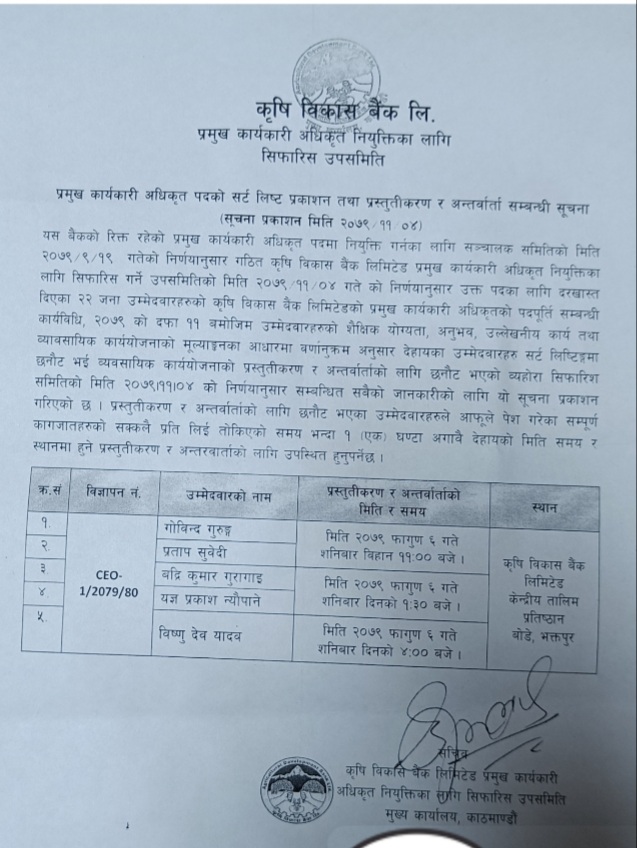 काठमाडौं । कृषि विकास बैंकको प्रमुख कार्यकारी अधिकृत (सीइओ) पदमा पाँच जना लिष्टिङमा परेका छन् । उक्त पदमा २२ जनाले खुला प्रतिस्पर्धात्मक प्रतियोगिताबाट पदपूर्ति गर्नका लागि आवेदन दिएका थिए। जसमध्ये ५ जनाको नाम सर्ट लिष्टिङमा परेको बैंकले जनाएको छ ।