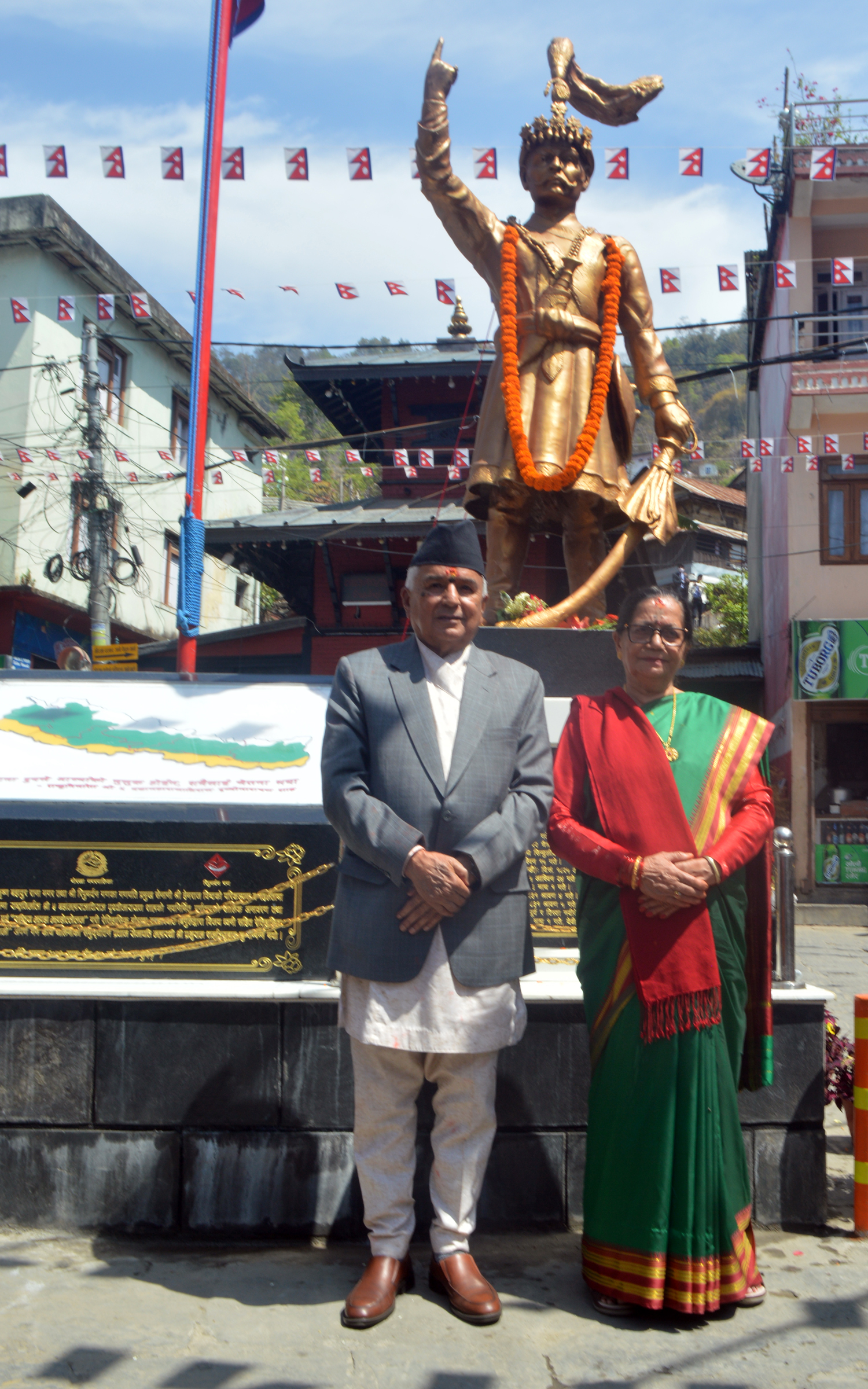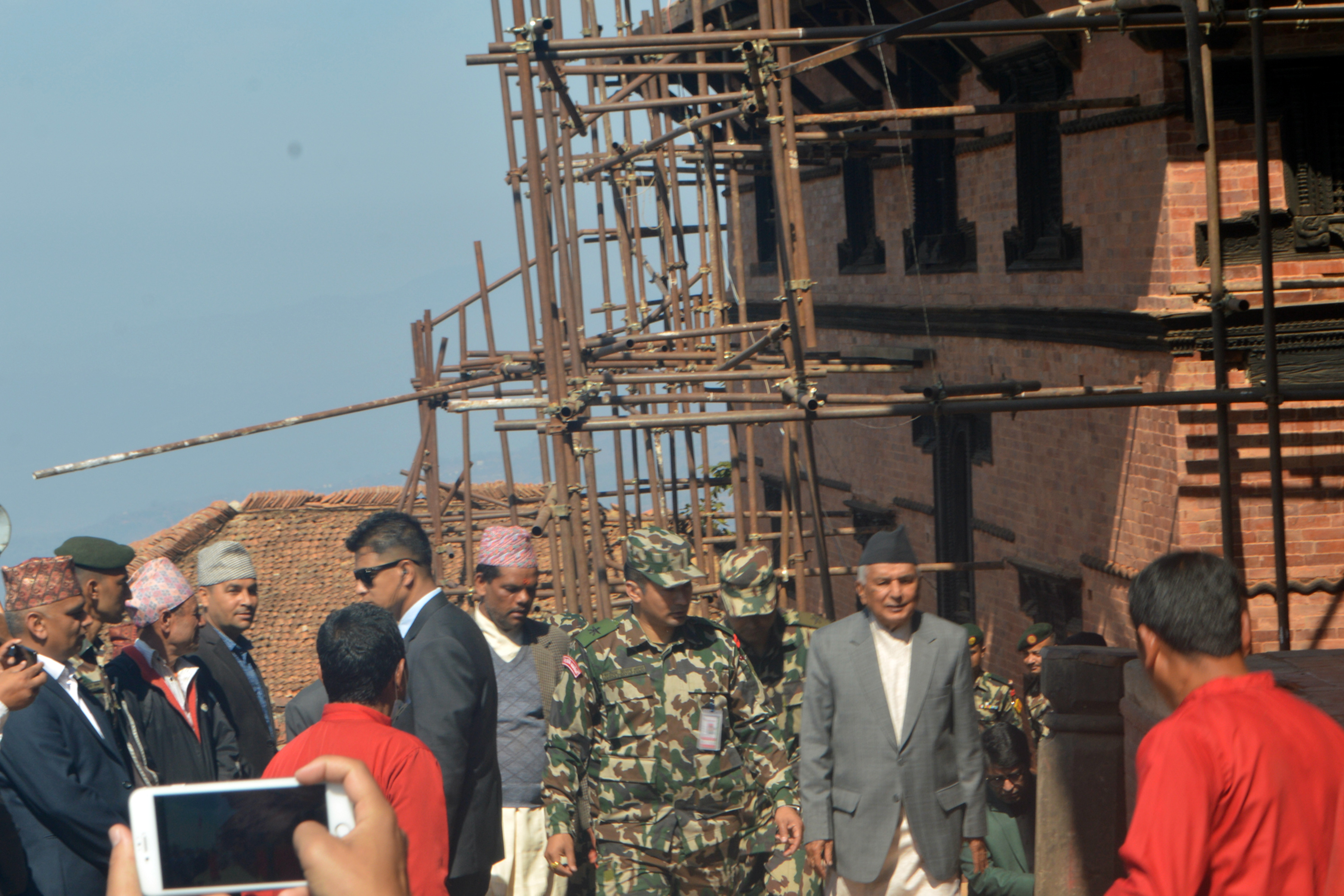 गोरखाको सदरमुकामस्थित गोरखकाली मन्दिरमा आइतबार पूजा अर्चनापछि गोरखा दरबार अवलोकनका क्रममा राष्ट्रपति रामचन्द्र पौडेल । तस्बिर:दीपक श्रेष्ठ/रासस