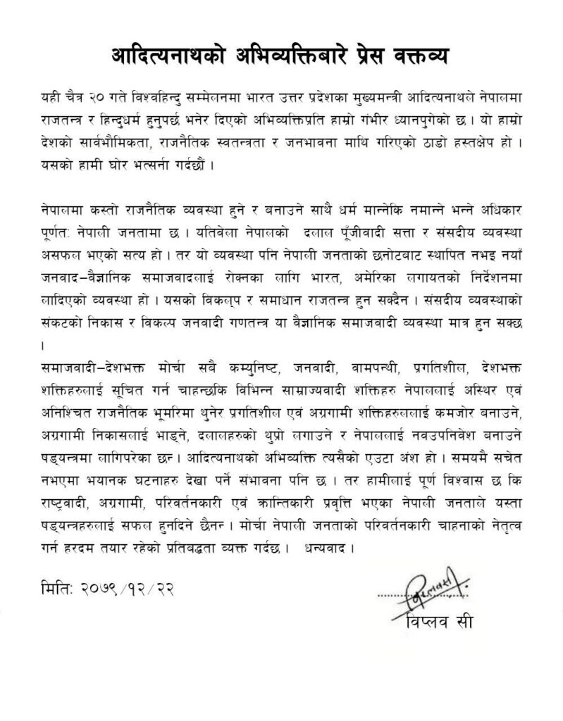 गत चैत्र २० गते विश्वहिन्दु सम्मेलनमा भारत उत्तर प्रदेशका मुख्यमन्त्री आदित्यनाथले नेपालमा राजतन्त्र र हिन्दुधर्म हुनुपर्छ भनेर दिएको अभिव्यक्तिप्रति विप्लवले आपति जनाएको हो । देशको सार्वभौमिकता, राजनैतिक स्वतन्त्रता र जनभावना माथि गरिएको ठाडो हस्तक्षेप गरेको भन्दै नेत्रविक्रम चन्द (विप्लल)ले सो भभिव्यक्तिमाथि घोर भत्सना गरेको छ ।