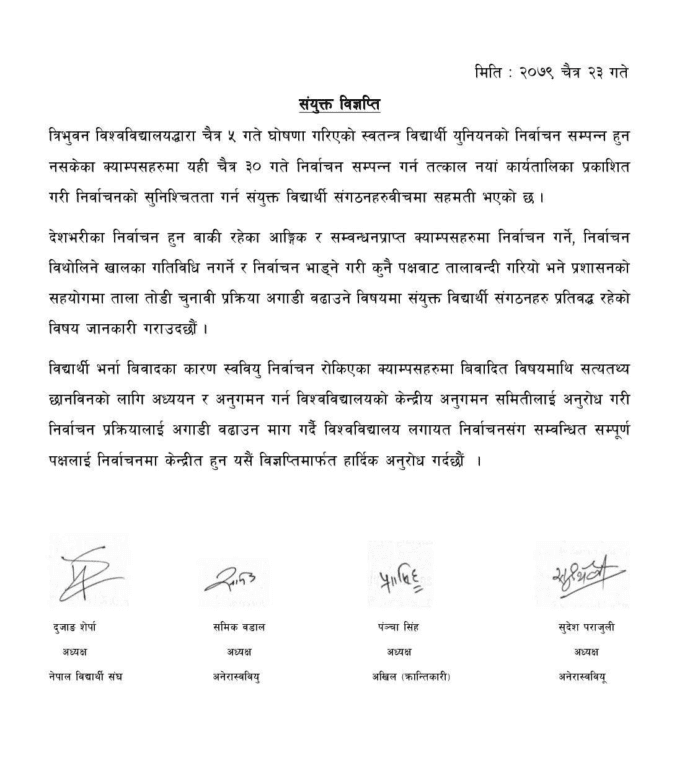 चुनाव हुन बाँकी क्याम्पसमा नयाँ कार्यतालिका प्रकाशित गरी चैत ३० गते मतदान गर्ने सहमति भएको उनीहरुले विज्ञप्ति जारी गरेर जानकारी दिएका छन् ।