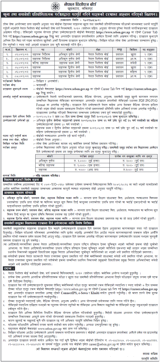 बोर्डले रिक्त पदपूर्तिका लागि २ सहायक निर्देश, १ वरिष्ठ सहायक र ३ सहायक गरी ६ पदमा दरखास्त खुलाएको हो ।